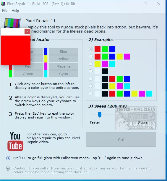 Rizonesoft Pixel Repair should be used with caution if you suffer from seizures or if epilepsy runs in your family due to the flashing, vibrant colors displayed as part of this app's function.