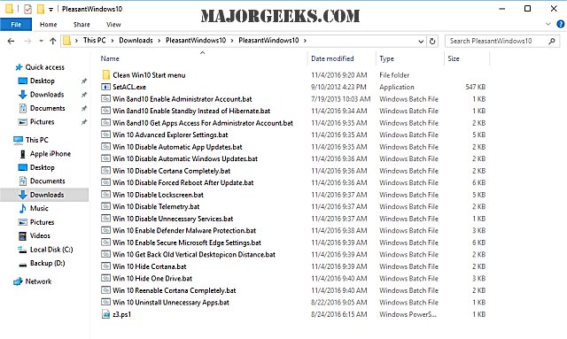 Pleasant Windows 10 is a collection of one-click batch files by Ghacks reader Joern that improve Windows 10 in various ways.