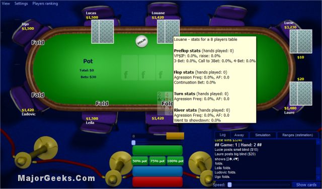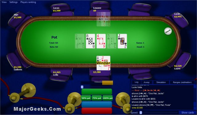 PokerTraining lets you improve your game and test new strategies by playing against up to 9 computer opponents having different playing styles.