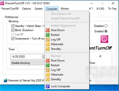 PreventTurnOff is a shutdown timer with a PC Anti-Blocking System that has the essential functions of Don't Sleep. The author decided to make this one after hearing that some users didn't like the numerous tasks in Don't Sleep. PreventTurnOff is a simple shutdown timer with the advantages of an anti-blocking system with a few extra features included.