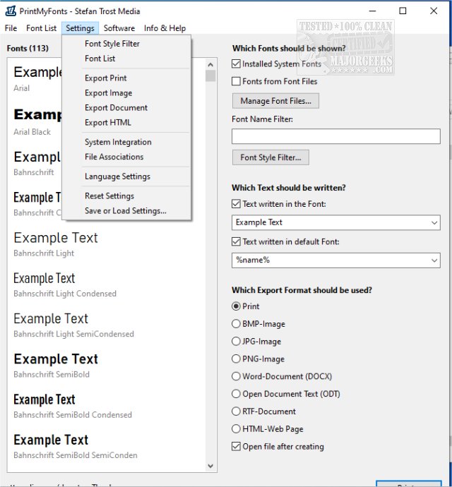 PrintMyFonts makes it possible to list all your installed fonts and arbitrary fonts from your hard drive or disk. You can type in any sentences or single characters displayed in the different fonts to compare these fonts. The font list can be displayed on your screen, or you can save the list as PDF, Microsoft Word document (DOC or DOCX), or image file in the formats BMP, JPG, or GIF. The best output format depends on your purpose. For example, an image output can be used to show a font list on your homepage.