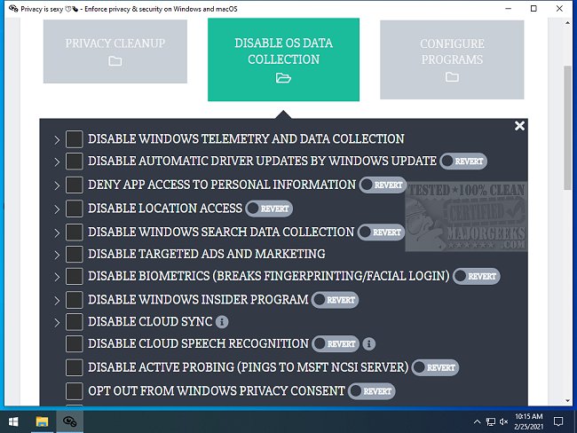 It gives you the ability to perform many different tasks from a convenient centralized location. You can easily delete any unused data, configure your apps, disable your default OS data-collection features, and so much more. Once downloaded and run, privacy.sexy displays an interface organized into nine categories; Privacy Cleanup, Disable OS Data Collection, Configure Programs, Security Improvements, Privacy Over Security, UI for Privacy, Disable OS Services, Remove Bloatware, and Advanced Settings. Clicking on one of these categories brings up the selections. You can click the corresponding checkbox to engage them as you see fit. Some items include a dropdown with additional fine-tuning choices. It also includes the ability to utilize pre-selected options for the different categories.