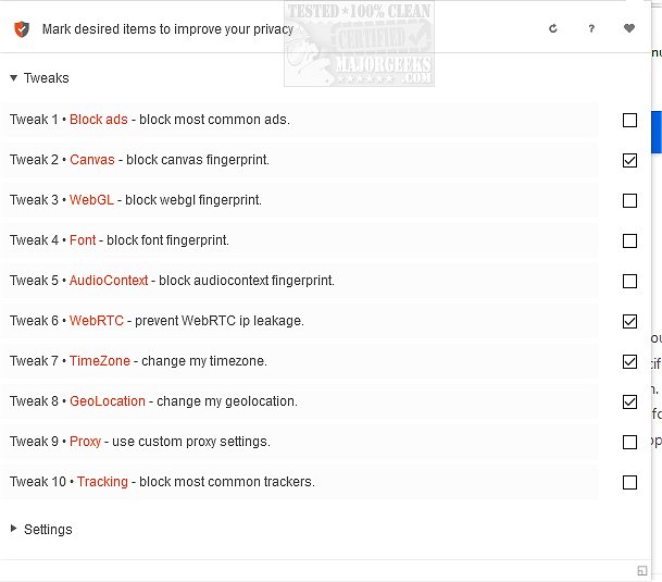 Privacy Tweaks covers most bases regarding the tweaks offered but should be considered a layer of protection that will fit within other privacy apps/extensions you are currently using.