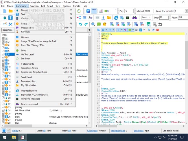 Pulover's Macro Creator will permit you to record your keystrokes, mouse movements, and clicks relative to the displayed window or screen. You can also easily reproduce your macros via automatic window activation as well as pause and play them step-by-step. No more will you need to suffer through long repetitive tasks as you now perform them instantly through numerous customizable Hotkeys. If the process calls for it, you create multiple macros within a single project. Not only that, but you can run programs, read, copy, and delete files. But wait, there's more! Pulover's Macro Creator can also send texts, execute image searches, show message boxes, add loops, goto commands, and much more. It features nearly 200 commands and functions from basic to advanced automation needs, all at your fingertips, easily accessible from the interface.