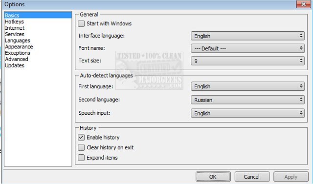 QTranslate supports over 56 languages outlined when you select a service to use to translate your target text. If the particular service can't perform the translation, the selection is grayed out. If this occurs, you can jump to another service and pull the translation from them. It can also look up individual words using several online dictionaries. You also have access to a spell checker and translation history of keeping track of your translations for future reference. There is also a virtual keyboard, an option to custom set the auto-detect language, and audio playback for your translation, including some regional accents.