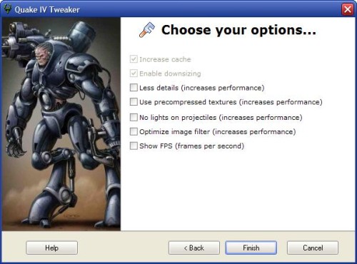 Tweaking program for Quake IV. It contains 7 different graphical settings tweaks, going from increasing cache to optimizing the image filter and showing the FPS.