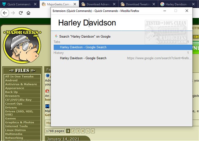 Quick Commands is a useful premise for retrieving specific tabs or browsing through history, and even performing an internet search from within the add-on. However, the results will pop open a new tab.