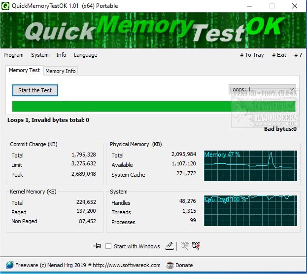 QuickMemoryTestOK can also be utilized for testing your Windows PC for any high memory behavior that may be the cause of other potentially serious system errors.