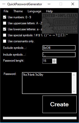 QuickPasswordGenerator will quickly generate random passwords of a specified length, using numbers, upper and lowercase letters, as well as special symbols. To create a password, you can use the default; you'll only have to click on the 'Create' button. If you want to further customize options for creating, change their password before pressing the button.