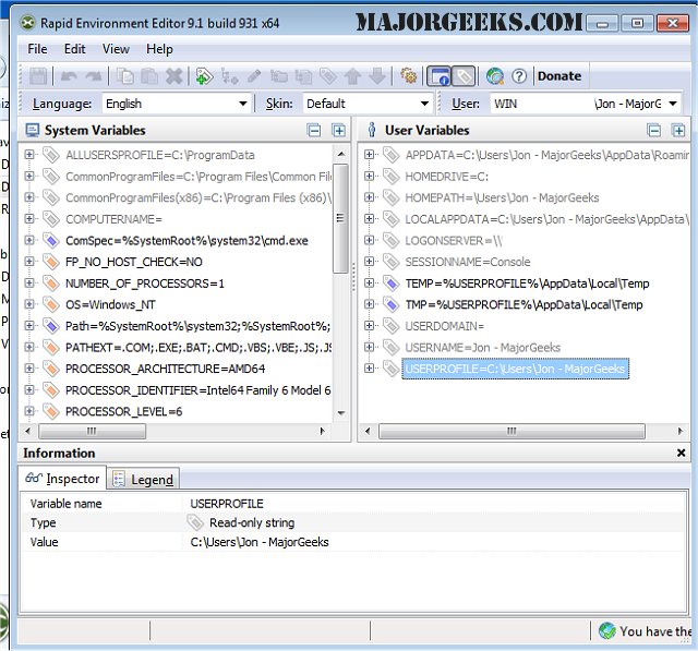 You have an editable tree for showing environment variables and values, and it will automatically check for invalid pathnames and filenames. It also includes a variable inspector for displaying miscellaneous information about variables: name, type, value, (short) file name in the 8.3 naming convention for each long file name and vice versa. You can also backup any environment variables to the registry file.
