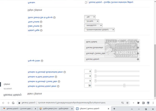 Besides history retrieval, Recent History also includes other options in the "Options" section. You can display recently visited pages and recently closed tabs as well as frequently visited and recently bookmarked items. You can also specify the number of things to be displayed for each category and change the order of the pop-up menu between the most visited pages and the recent history, closed tabs, or bookmarks. Additionally, Recent History allows you to customize various appearance aspects.