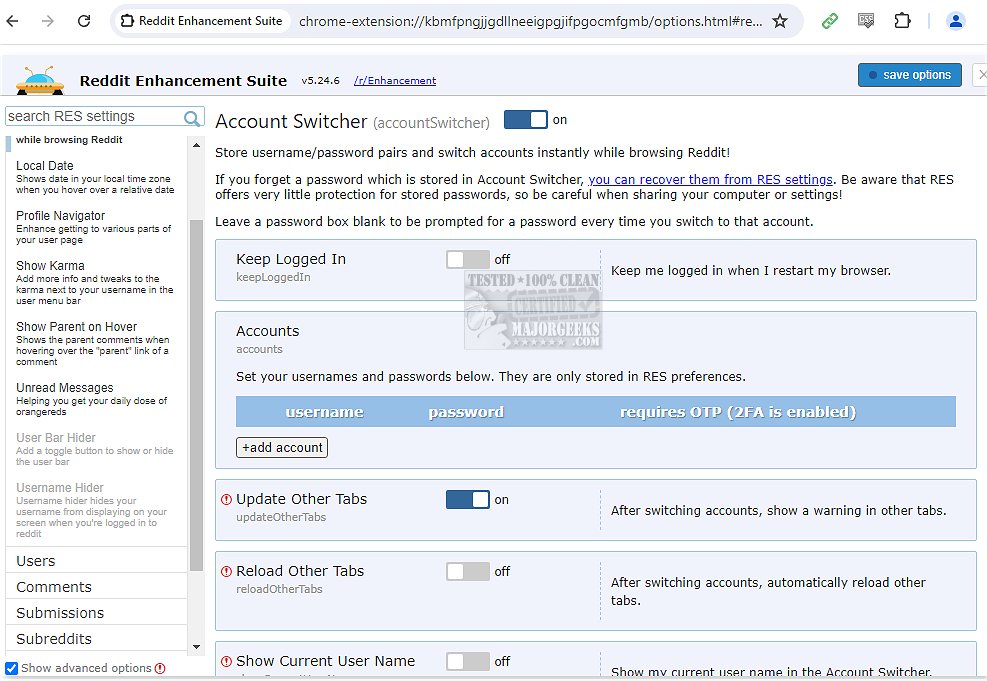 The account settings of Reddit Enhancement Suite allow you to add multiple accounts and facilitate seamless switching between them without having to leave Reddit. Moreover, the extension can keep you logged in even after restarting your web browser.