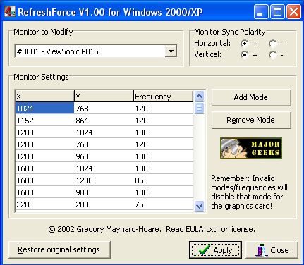 RefreshForce UNIVERSALLY and PERMANENTLY fixes the Windows 2000/XP refresh rate problem on ANY variation of graphics cards, monitors, or drivers!!!