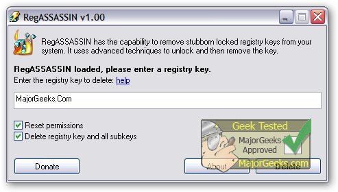 RegASSASSIN is a portable application which makes difficult to remove registry keys placed on your system by malware a thing of the past. The program allows you to remove registry keys by resetting the keys permissions and then deleting it. Please use with caution as deleting critical registry keys may cause system errors.