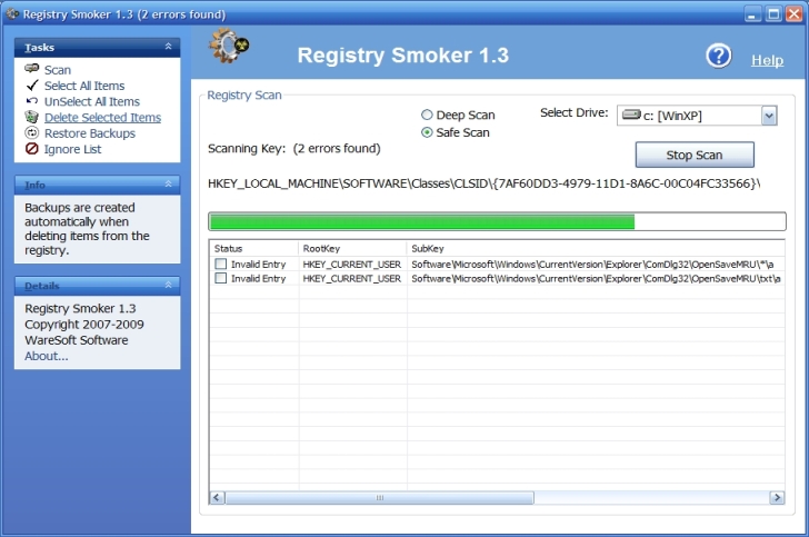 Registry Smoker is a program that is designed to do one thing and do it well. It searches for and removes invalid entries from your registry. Unlike other registry cleaning utilities, registry smoker doesn't try to find the most invalid entries that it can possibly find.