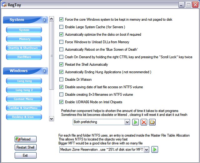 RegToy is a useful program that is used to Tweak Windows XP and Vista. It also includes some utilities like a renamer to change the filenames and a wallpaper changer. With RegToy you can optimize the performance of your computer and customize your system to suit your needs.