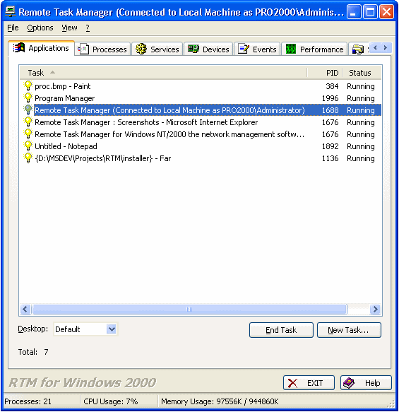 Remote Task Manager® (RTM) is a systems control interface that can be run from any remote Windows NT/2000/XP and Windows Server 2003 computer. This enables a Systems Administrator to control most aspects of a remote environment. The simple-to-use, tabbed interface separates applications, services, devices, processes, events, shared resources and performance monitor, making each of these very easy to control. A Systems Administrator can start or stop services or devices, add new services or devices, manage the run level and adjust the security (permissions, auditing and owner). The Process Function and the Task Manager allows remote termination and adjusting of priority. An Event Viewer lets the Administrator view all events as though they were being run on the host computer. The Performance Monitor displays a dynamic overview of the computer's performance (CPU and memory usage). RTM even supports remote installs, enabling a Systems Administrator to set up a service on remote machines without ever having to physically go to them. RTM adds the ability to lock/shutdown/reboot and to create processes on remote computers.