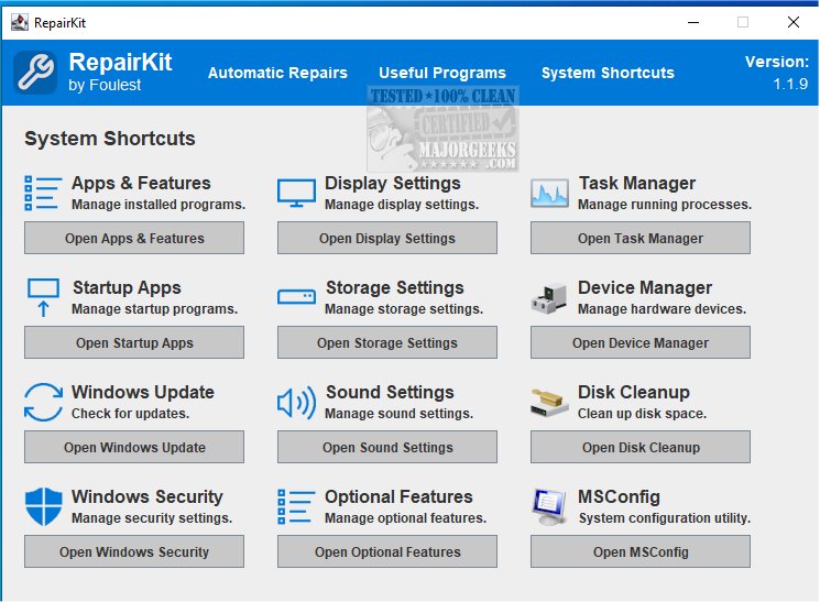 RepairKit is a solid option for those who don't want to spend too much time on PC maintenance. Besides offering a simple solution through the Automated Repairs section, RepairKit also provides a centralized platform to access Windows' most useful system maintenance features. Some features include Startup Apps, Display Settings, Apps & Features, and Device Maintenance. All these features are combined under a single, centralized layout as dedicated shortcuts for easy accessibility.