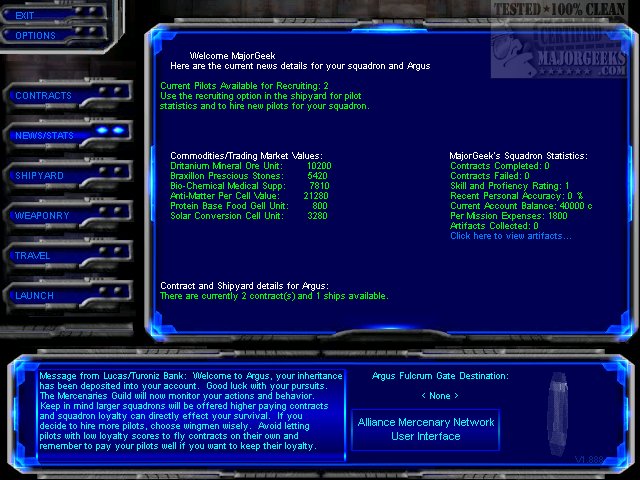Each planet specializes in one or more areas; for example, weapons on the planet Deneb are much less expensive than on the planet Fauston. Outside Alliance territory, the player is likely to find more lucrative areas, but the contracts will be more dangerous. After following the clue trail and obtaining all of the artifacts (which lead the player on a wild goose chase to locate the rest, the last giving the location of the RiftSpace portal), the player may progress through the red wormhole leading to RiftSpace.