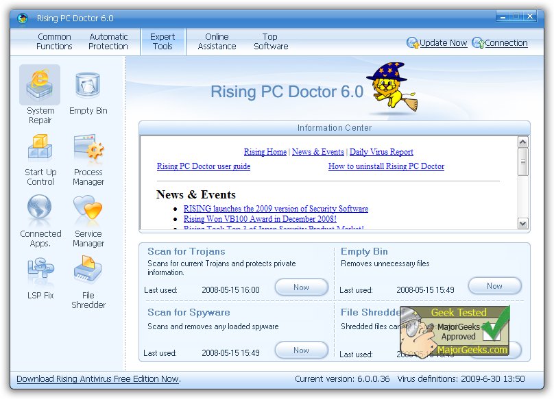 Rising PC Doctor can detect the majority of Trojans and a even great number of other malware upon startup before they can execute their malicious function. This function will significantly increase your protection from cyber threats.