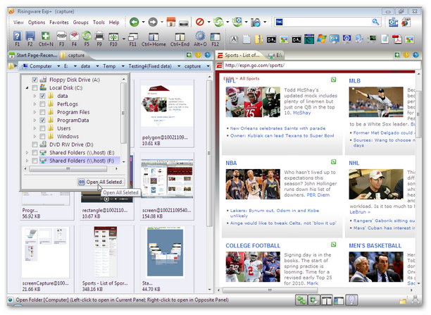 With dual panels and tabs, Risingware Exp+ seamlessly integrates most indispensable software into one, a dual-panel Windows Explorer replacement, a multi-process web browser based on Trident (IE) layout engine, and some handy utilities.