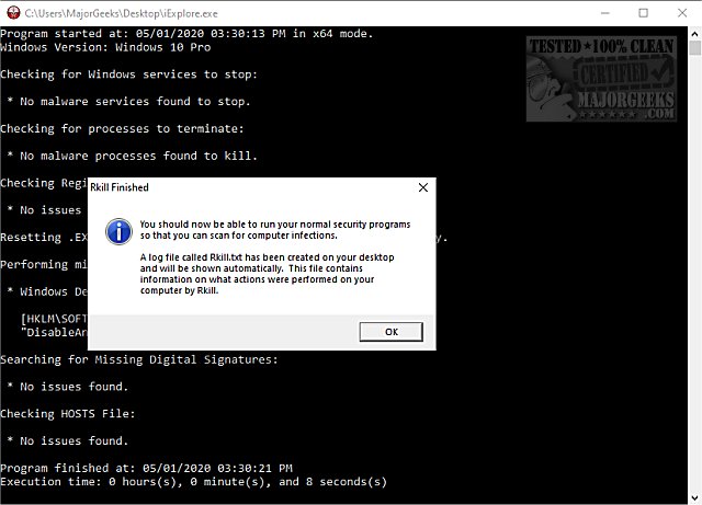 Using Rkill iExplore.exe is easy; just double-click on iExplore.exe and wait for the results. You will be notified when the scan has completed, and you can find Rkill.txt on your Desktop with the results.