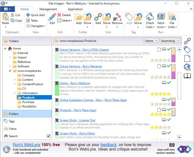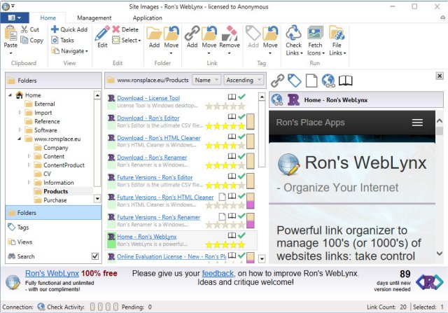 Rons WebLynx is a powerful link organizer to manage 100's or even 1000's of websites links so you can take control of your internet.