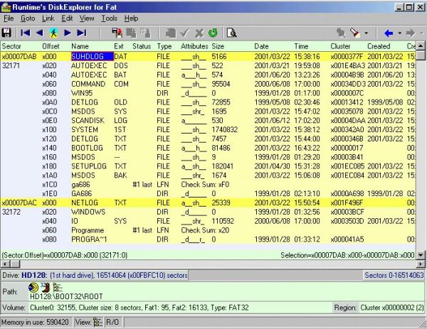 Runtime's DiskExplorer for FAT is a Windows based Disk Editor for FAT file systems.