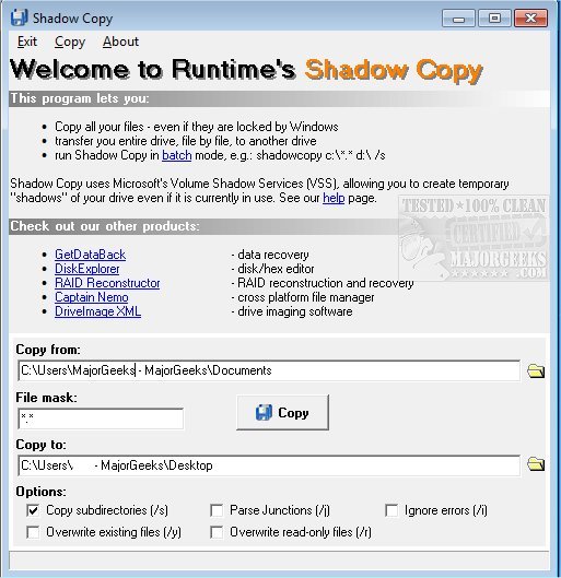 Runtime's ShadowCopy Utilizes Windows' Volume Shadow Services, enabling you to obtain copies of files even if they are in-use or rendered unavailable by Windows. It will prove useful when you need to make backups but do not want to close any of your applications or documents.