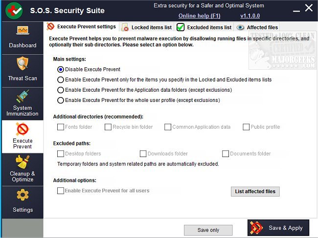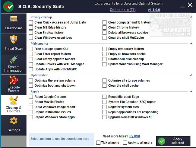The included System Optimization module will help keep you safe by ensuring that you have the best privacy, performance, and reliability for your system. S.O.S. Security Suite can either be installed as a portable tool or an installer; the option is given during install.