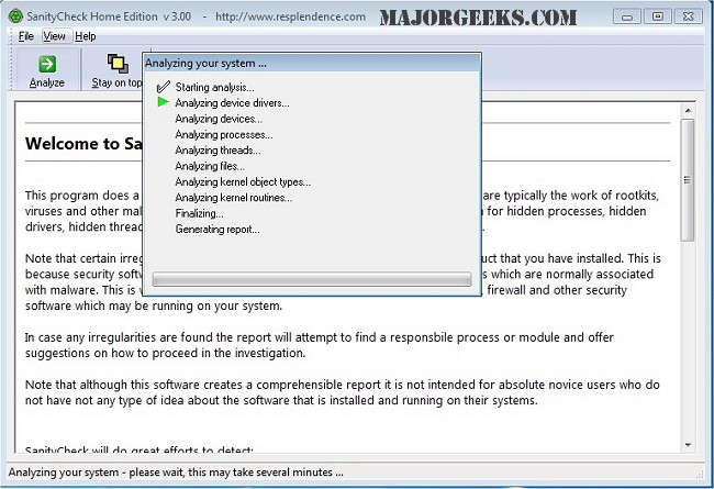 SanityCheck is an advanced rootkit and malware detection tool for Windows which thoroughly scans the system for threats and irregularities which indicate malware or rootkit behavior..