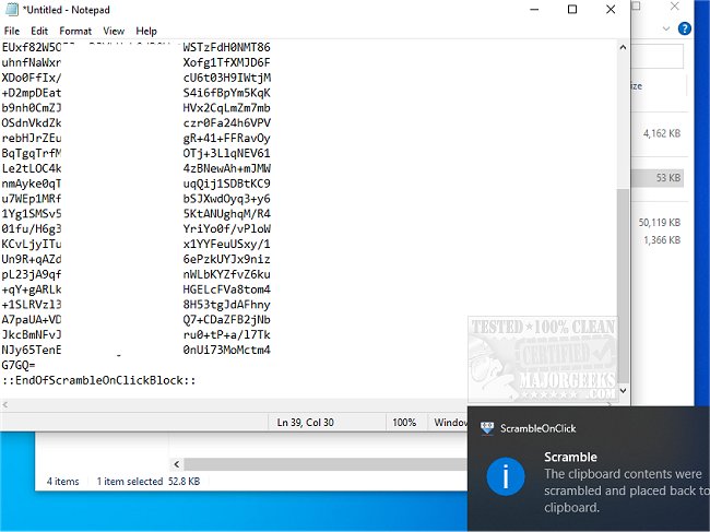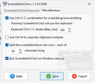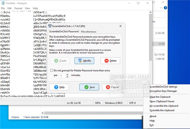 Usage of ScrambleOnClick is relatively easy, but it will take a second to become acquainted. You then will be able to use it on a selected text document that you want private to ensure it will remain as such. Make sure you remember your passwords! You can perform most actions via hotkeys or via the systray icon. ScrambleOnClick has just enough features, making it a good choice for encrypting various types of text documents.