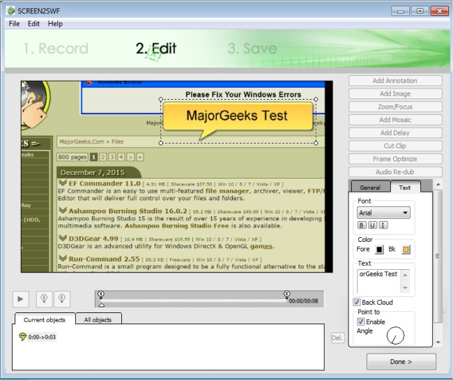 Screen2SWF also allows you to add customized annotations, images, sound and simple text to your recording.