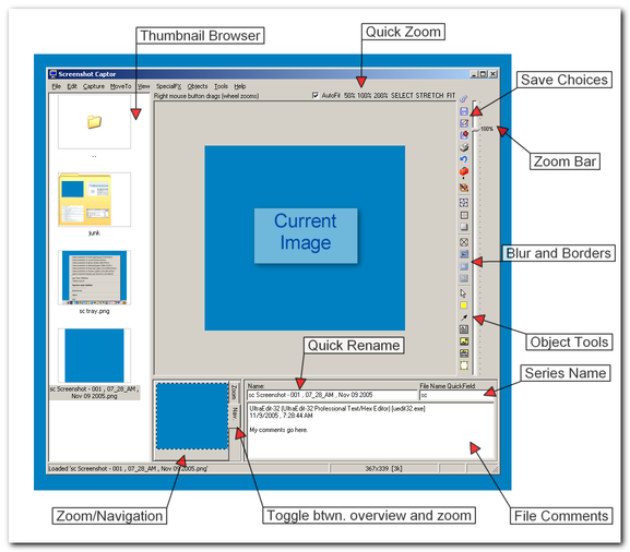 Smart auto-naming of files and ability to embed textual comments in files; automatic image file versioning - with tons of options for automatically naming the file and inserting comments.