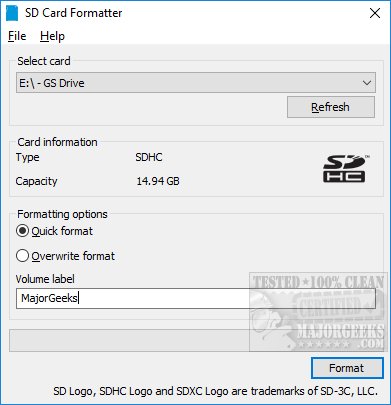 SD Memory Card Formatter formats SD memory cards, SDHC memory cards, and SDXC memory cards with either a quick format or an overwrite format to make the data unrecoverable.