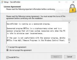 While installing SecretFolder, pay very close attention as it offers BRTSvc, a Cryptocurrency miner, which is marked install by default. See the included screenshot below. It also disables your machine's indexing service as SecretFolder will not work properly when enabled and shows in-app ads.