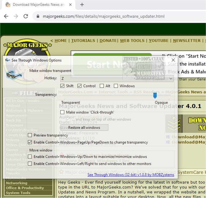 See Through Windows allows you to perform several functions with just a few clicks. It can be activated via a hotkey combo, and once enabled, it offers various options within its user-friendly interface. These options include preview transparency, which lets you preview content behind a window without interacting with it, moving the window, and a transparency level slider, which enables you to adjust the degree of transparency to your liking.