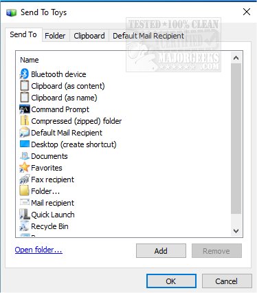 Send To Toys control panel applet allows you to manage the Send To system menu content, and configure the various Send To Toys settings.