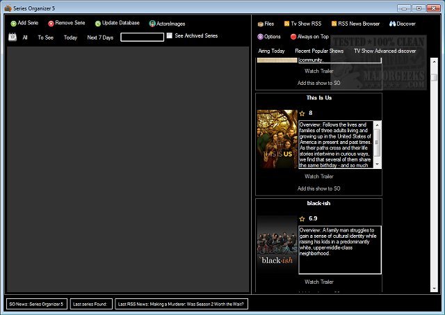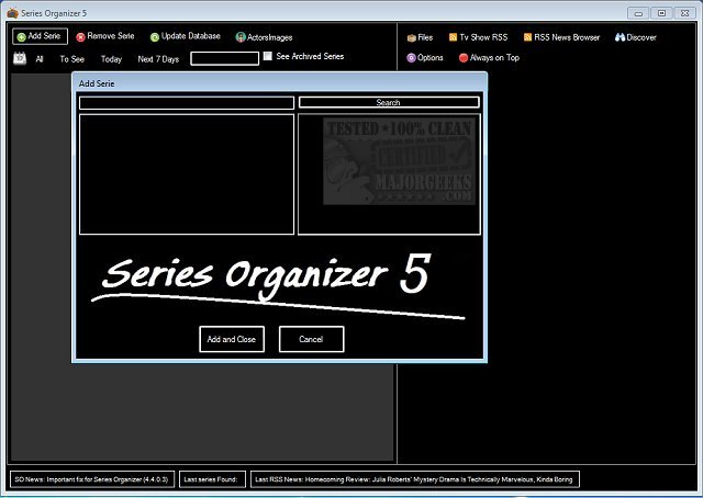 The interface of Series Organizer is a little rough around the edges, but don't let that stop you. Sometimes the mouse cursor disappears in forms. Pressing buttons does not have any reaction, so you can't always be sure you pressed a button. Since the databases are massive, this often leaves you looking at the screen for a minute. The buttons sometimes have letter outside of your view or words shortened to make them fit, but it's not rocket science. These include Add Series, Remove Series, Update Database, All, Archived, and To See. There are options, but they loaded behind the main application so we couldn't get to them. You might not have these issues, as we test in a virtual machine. In this case, the app was bigger than our virtual machine so we ran into some proprietary problems. Occasionally, on the first search, we would get an error, but on the second try, it worked. The author has addressed several of the initial observations mentioned above with this current release and continues to improve the app.