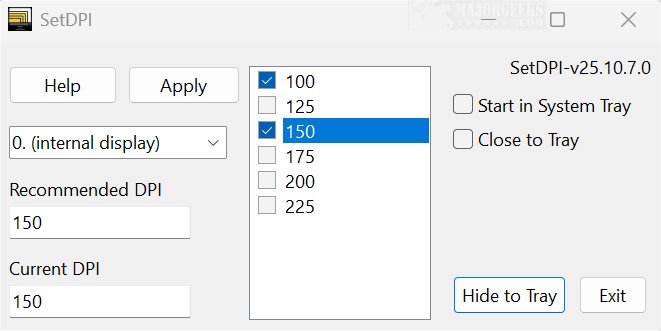 SetDPI enables you to quickly and efficiently adjust the system's DPI (dots per inch) scaling settings through a straightforward process. This utility is particularly beneficial for those who frequently switch between different display resolutions or screen sizes, as it allows for seamless customization of text and image clarity across various applications.