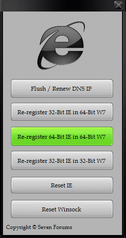 This is small utility for Troubleshooting Internet Explorer issues. It will Flush DNS, Re-register concern dlls for Internet Explorer (3 different types 64-Bit, 32 Bit on 64-Bit OS and 32-Bit) Reset IE to Default settings, Reset Winsock.