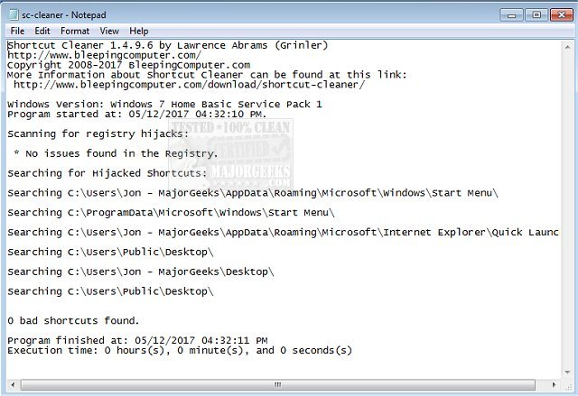 When run, Shortcut Cleaner will scan various locations on your computer for Windows shortcuts. When a shortcut is detected, it will check properties for a possible hijacking. If one is detected, it will automatically clean the shortcut so that it no longer opens the offending program or website. When the Shortcut Cleaner has finished scanning your hard drive, it will create a log file on your desktop called sc-cleaner.txt and then display it. This log file will contain a list of all the shortcuts that were detected and cleaned.