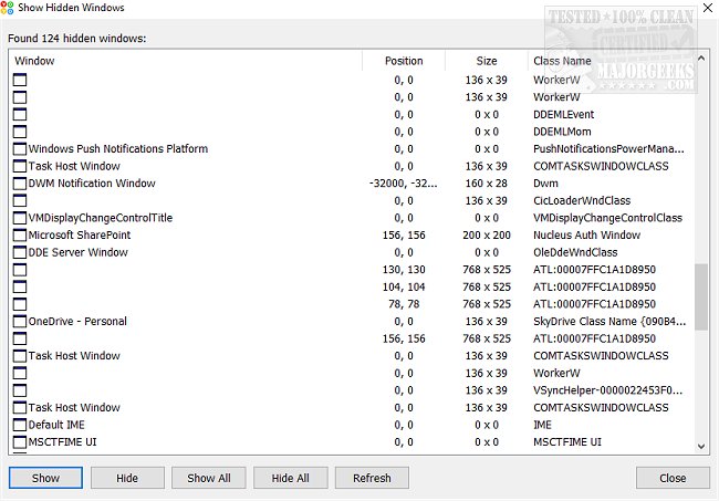 Show Hidden Windows finds hidden processes and displays them. It shows how many hidden windows there are directly from the UI. The results include information like the position, size of each window, and class name. There is no help available with this app. You can click the Show button to see each result, but you have to manually resize and move each window.
