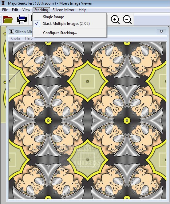 Silicon Mirror and Kaleidoscope can also be used for static mirror or kaleidoscope images, but the screensaver animation ability is what we honed in on. Setting up your image is relatively easy. It supports drag n' drop of images, and then through the simple UI, you will first select the Stack Image button, which breaks out the image into a configurable pattern. Then you hit the Silicon Mirror icon, which brings up an overlay that allows you to position it upon your image to create the desired effect. Saving the completed image as a screensaver is as it would generally be for a Windows machine.