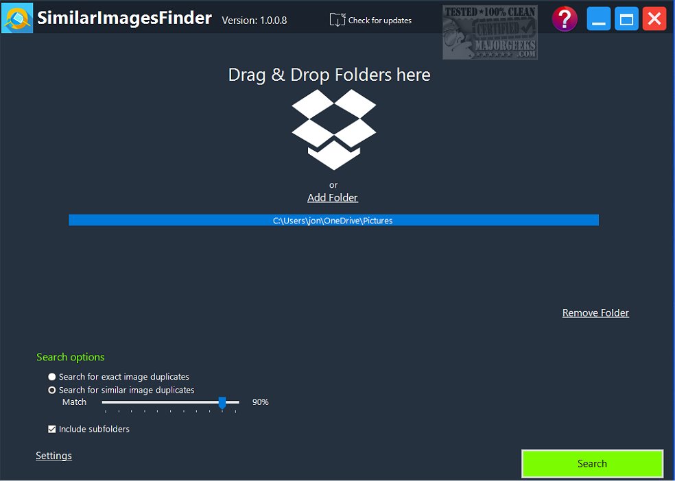 SimilarImagesFinder has two modes: find identical pictures and find similar images. The duplicate picture remover's first mode searches for completely identical image files. In the second mode, the app's similar image finder searches for different images but are the same. For example, it may be two images from the same image but of varying size or dimensions or various shades of color, etc.