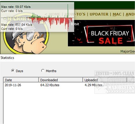 Simple Bandwidth Monitor provides you with a realtime graphical display of your network usage with the added ability to target daily and monthly download and upload statistics. It will save the current statistics every 10-seconds, with all recorded rates being displayed in bits per second (Kilobits or Megabits). The usage display is color-coded with red signifying upstream traffic and green downstream.