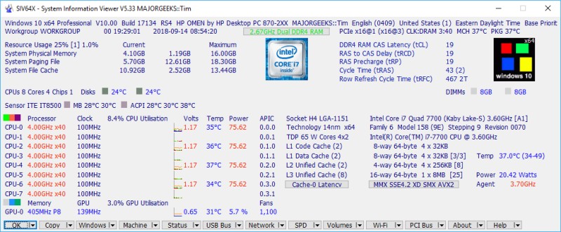 SIV is a general Windows utility for displaying system information. It can be used to display information about the CPU, PCI, PCMCIA, USB, SMBus, SPD, ACPI, and more. SIV is designed for Windows 11, 10, 8.1, 8.0, 7, Vista, XP, 2022, 2019, 2016, 2012, 2008, 2003, 2000, NT 4.00 and NT 3.51.