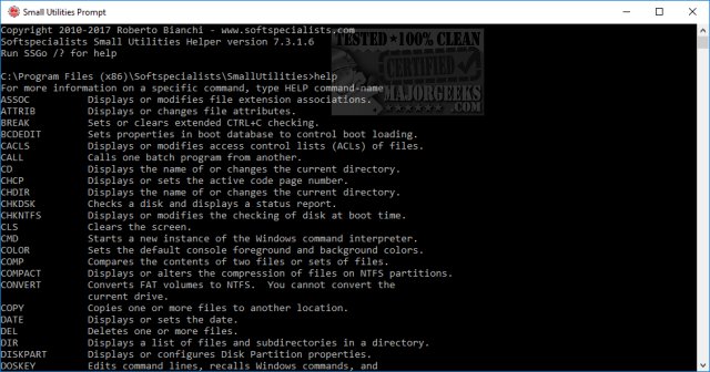 Small Utilities Suite can be a bit overwhelming at first. There's a utility for just about anything a tech could need, and you do need some familiarity with the command prompt. You can type help within the command prompt for a list, as shown in the screenshot. We admittedly got a little lost once or twice after testing commands, but it's worth it for the advanced user.