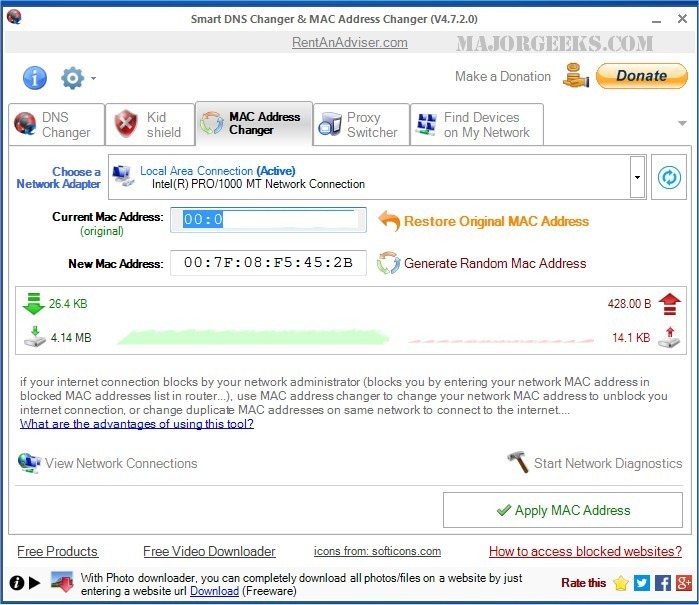 MAC address changer permits you to change your network MAC address to connect to the internet, this can useful if your internet connection is blocked by a network administrator for instance. It is also useful for changing duplicated MAC addresses within the same network.