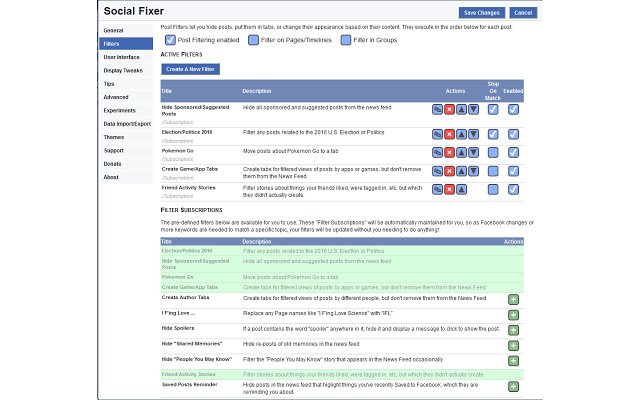 Social Fixer for Facebook will plug into your browser and improve the Facebook.com website. Social Fixer for Facebook is filled with numerous features to make your Facebook experience better and potentially more secure. You can filter posts in the news feed by content, author, link, URL, and more. Social Fixer for Facebook also includes built-in Filter Subscriptions, which will allow you to pick a filter and use it. There are also pre-defined filters that include hiding Sponsored Posts, Political posts, things your friends like, and much more.